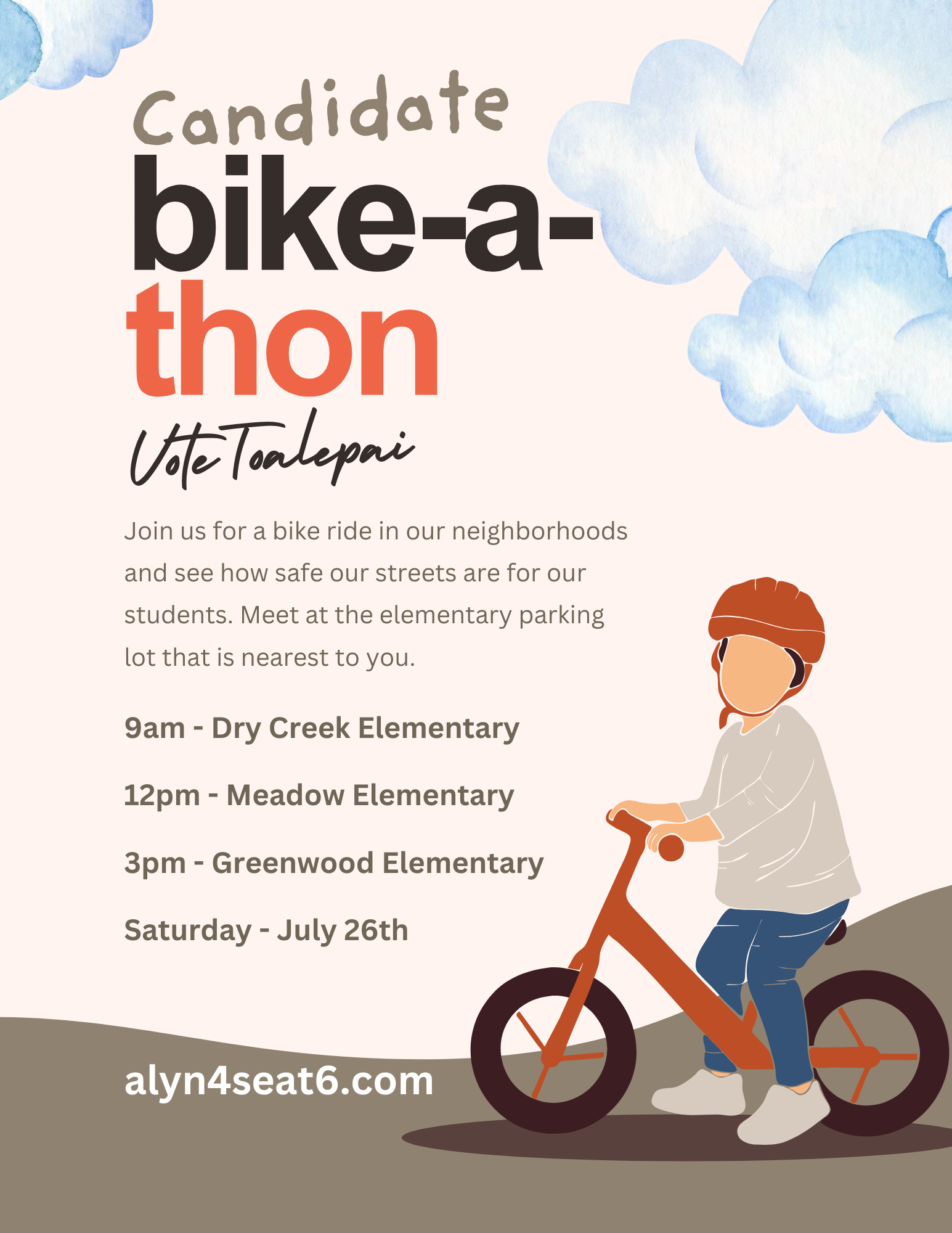 July 26th join us at your nearest Elementary School with your bike and ride with us through your neighborhood. See map for route.